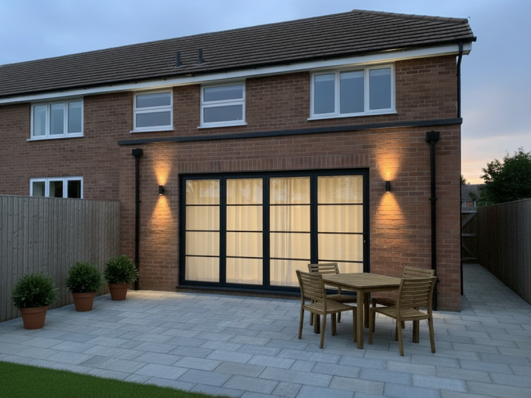 Single storey rear extension with open plan living space and porch.