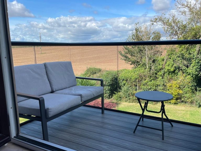 External decking area over an existing brook with new glazed doors to house.