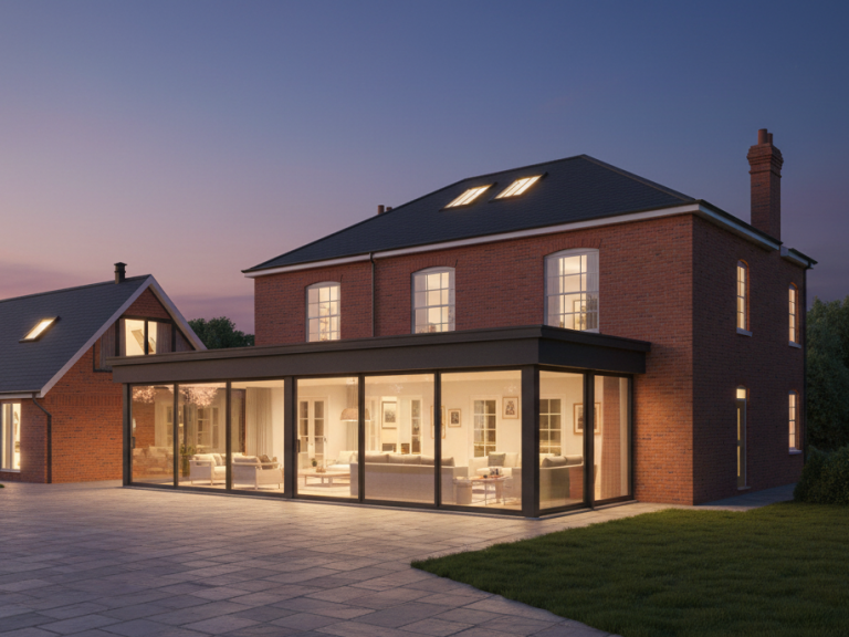 Contemporary glazed rear extension and link between house and existing outbuilding.